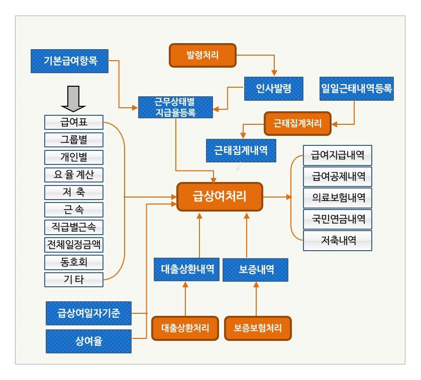 급여 처리를 위한 기본정보로 다양한 기본 급여항목을 등록할 수 있도록 지원하며, 이를 기반으로 발령내역, 근태 내역을 집계처리하여 급.상여를 처리하게 되며, 다양한 공제 내역을 계산에 반영하여 최종 급여를 산출하게 됩니다.