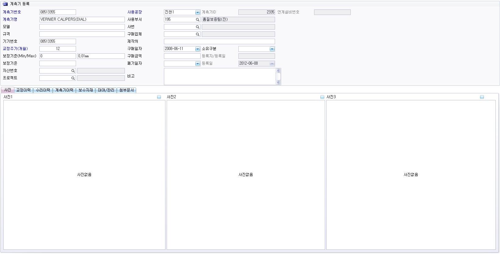 품질관리에 필요한 각종 계측기를 관리하기 위하여 계측기에 대한 종합적인 정보를 입력관리하고, 계측기의 교정내역, 교정계획, 차기교정일자 및 예상일정을 관리할 수 있는 다양한 기능을 제공합니다.