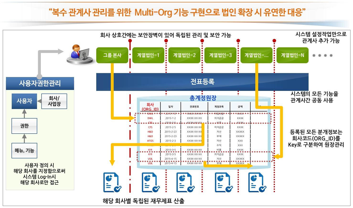 시스템을 물리적으로 분리하지 않고 한 시스템, 즉 한 DB 내에서 계열 법인을 통합 관리하고자 하며, Log-In, Log-Out 반복 없이 법인 한 시스템 내에서 법인 선택을 통해 원하는 자료를 제공 받을 수 있기를 원하며, 선택적으로 법인 및 사업장의 재무제표 등에 대한 자료를 한 법인, 혹은 여러 법인을 선택하여 통합하여 조회하고자 합니다.