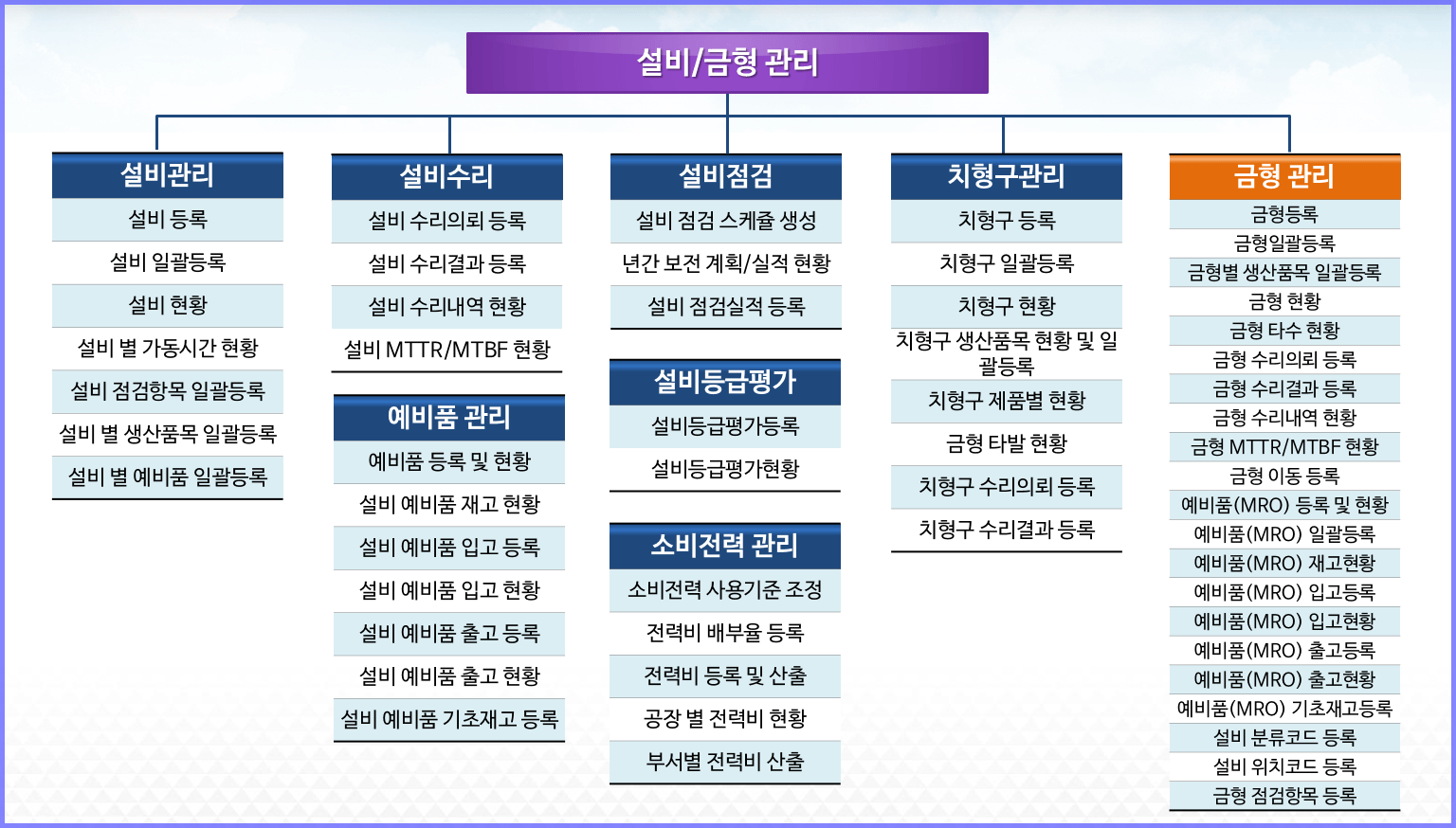 본 설비관리 시스템은 기업내 생산 등과 관련된 설비의 제원을 등록하고 예방점검 계획에 따른 실적 등을 관리할 수 있는 시스템입니다. 설비 투자 계획 대비 실적을 관리하고 기타 계측기 및 시험설비에 대한 관리를 추가적으로 할 수 있습니다.