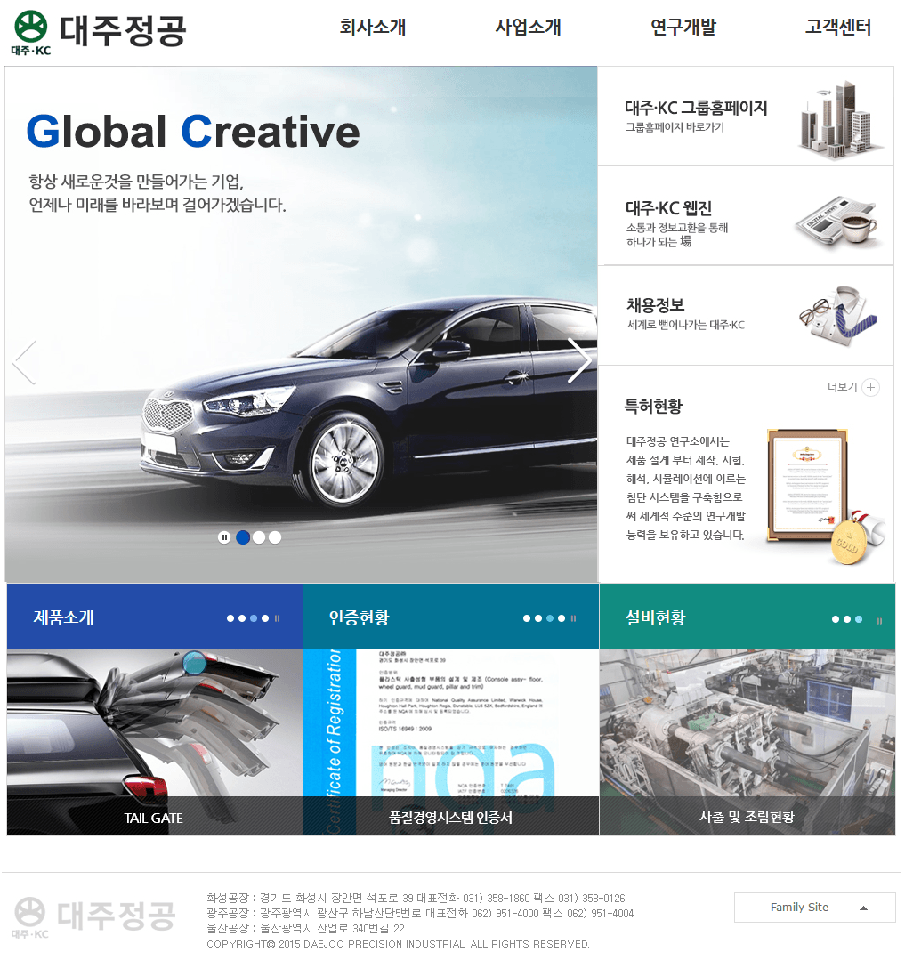 경기도 화성에 위치한 (주)대주정공과 ERP 구축 계약을 체결하였습니다. (주)대주정공은 차량용 프라스틱 사출품 제조 전문업체로 자동차 내장부품의 핵심인 콘솔을 주력으로 테일게이트, 휠가드, 필라 등의 자동차 내외장 부품을 생산하여 고객사에 납품하고 있는 사출 전문기업입니다.